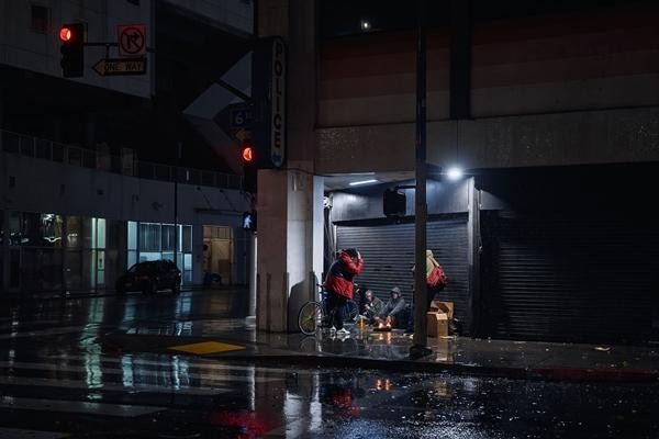 当地时间12月24日,美国加州,在洛杉矶市中心街头露宿的无家可归的人聚在一起烤火。视觉中国供图